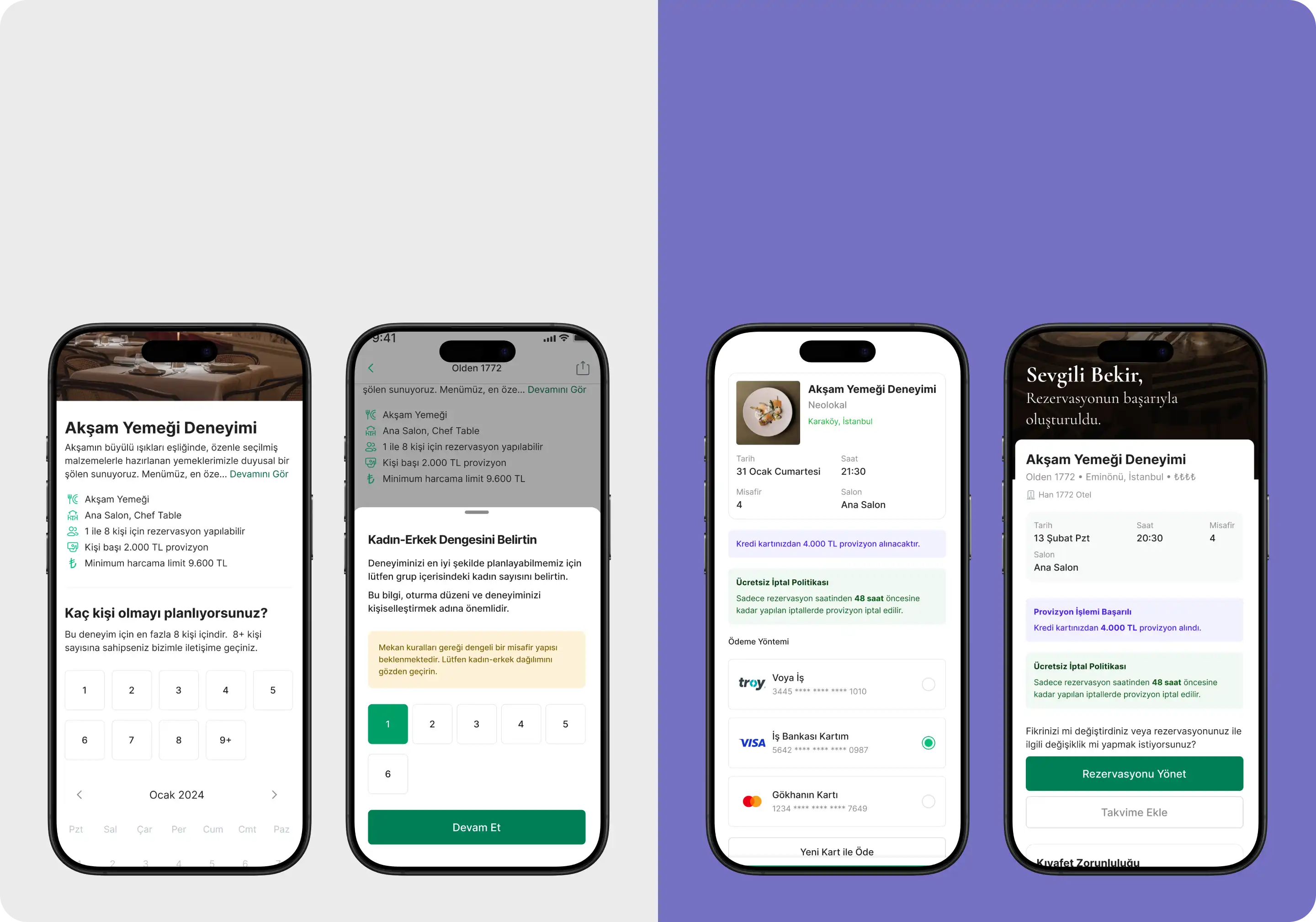Rezervasyonda kullanıcıya özel detaylar; araç plakası tanımlamadan alerjen bilgilendirmesine, özel gün taleplerinden ön ödeme ve özel araç deneyimine kadar her adımı kişiselleştirerek sıradan bir akşamı özenle tasarlanmış bir deneyime dönüştürün.